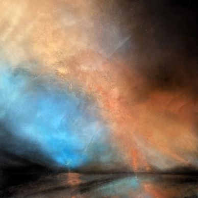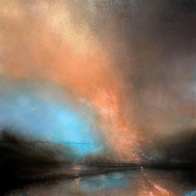 Julie’s inventive and distinctive work uses heating and the natural rusting, oxidation and corruption of copper and brass sheets as the foundation for her mixed media land and seascapes. Julie adds pastels, spray paint and other media to build her paintings, often scraping away materials to expose the pure metal underneath. These combined textures and raw metal give a light that glistens from deep within the waters of her seascapes.